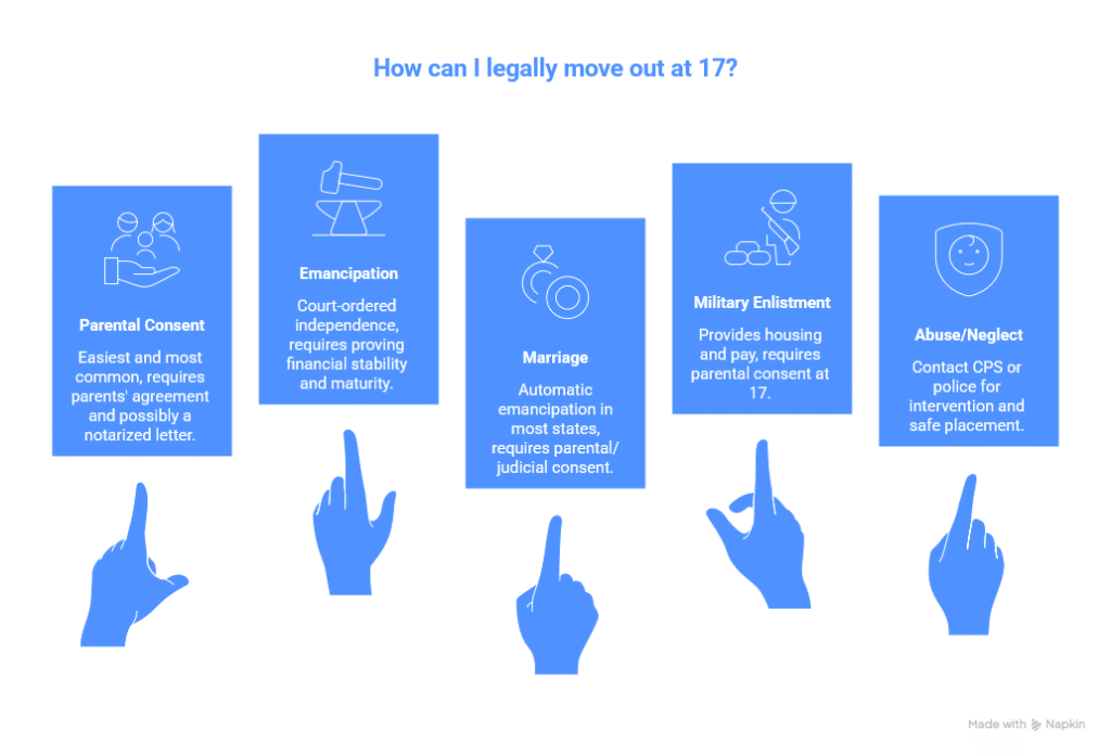 Moving out at 17 involves legal steps to ensure safety and responsibility. Knowing the legal ways helps avoid trouble with the law or family. Each method has rules and requirements to follow closely.