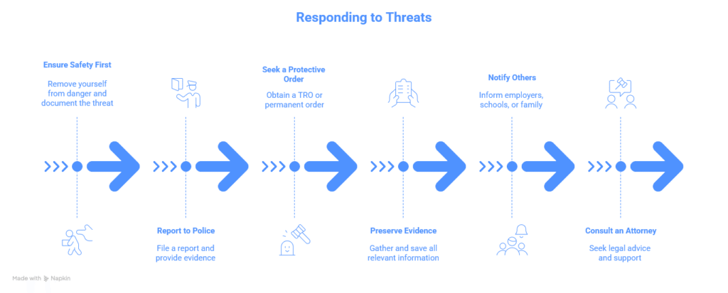 Taking legal steps after a threat protects your safety and rights. Report threats to police quickly and clearly. Keep detailed records of all threatening messages or actions. Stay calm and seek support from trusted people. Knowing your legal options helps you feel empowered and secure.